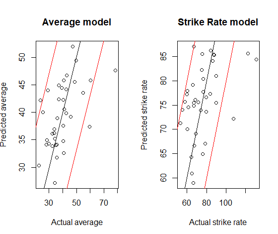 I've added in the red lines manually, They show where roughly 95% of the data fits. Within 17 of the average and within 20 of the strike rate. Those are huge variations, which shows that it's very difficult to predict test performances based on limited overs performances.