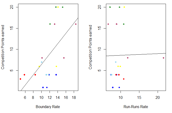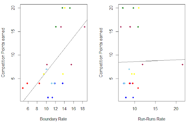 There is a reasonably strong relationship between the boundary rate and the points earned in a match, however, there's almost no relationship at all between the speed of accumulation of non-boundary runs and the points earned.