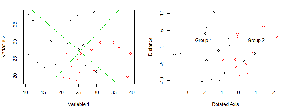 An example of how LDA works is in the two graphs below. There's a set of data that has two variables and is in two groups, and can't be easily distinguished by splitting any variable alone (displayed on the graph on the left). By making a decision based just on Variable 1, the best split gets 20 out of the 30 points classified correctly, and the best split on Variable 2 gets 22 out of the 30 points classified correctly. But if we put in a set of axes that are rotated, (the green lines) and redraw the graph (on the right) the two groups are able to be split quite well by being greater than or less than -0.45 on the new rotated x axis. By splitting on the rotated axis, 27 out of the 30 points are now classified correctly.
