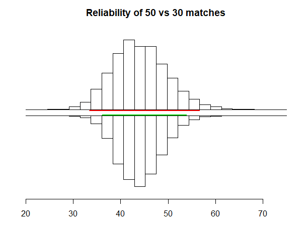 The red and green lines here are the 95% bands for the simulated data. With the 30 match averages, the player who should have averaged 45 tended to average somewhere between 33 and 58. With 50 matches, the player tended to average between 36 and 54.