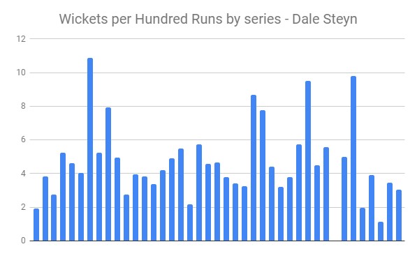 Here's an example - Dale Steyn's series average vs his Wickets per Hundred Runs per series.